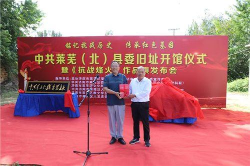 ▲ 劉玉峰(左)出席萊蕪縣委舊址開館儀式并向紀(jì)念館贈(zèng)書
